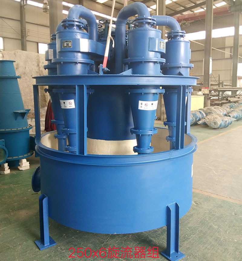 主要用于石灰石、电石渣等脱硫吸收剂的分级。经球磨机磨碎后的石灰石料浆泵入旋流器内,在旋流器内通过离心力作用完成粗细颗粒的分级。粗颗粒通过旋流器底流返回磨机再磨,细颗粒通过溢流送入石灰石浆液罐。成品浆液重量浓度为30%,细度为-325目(或-250目)≥90%。